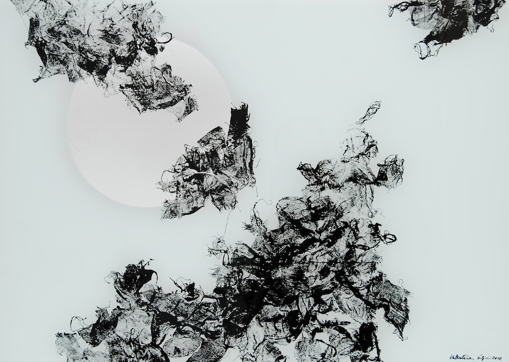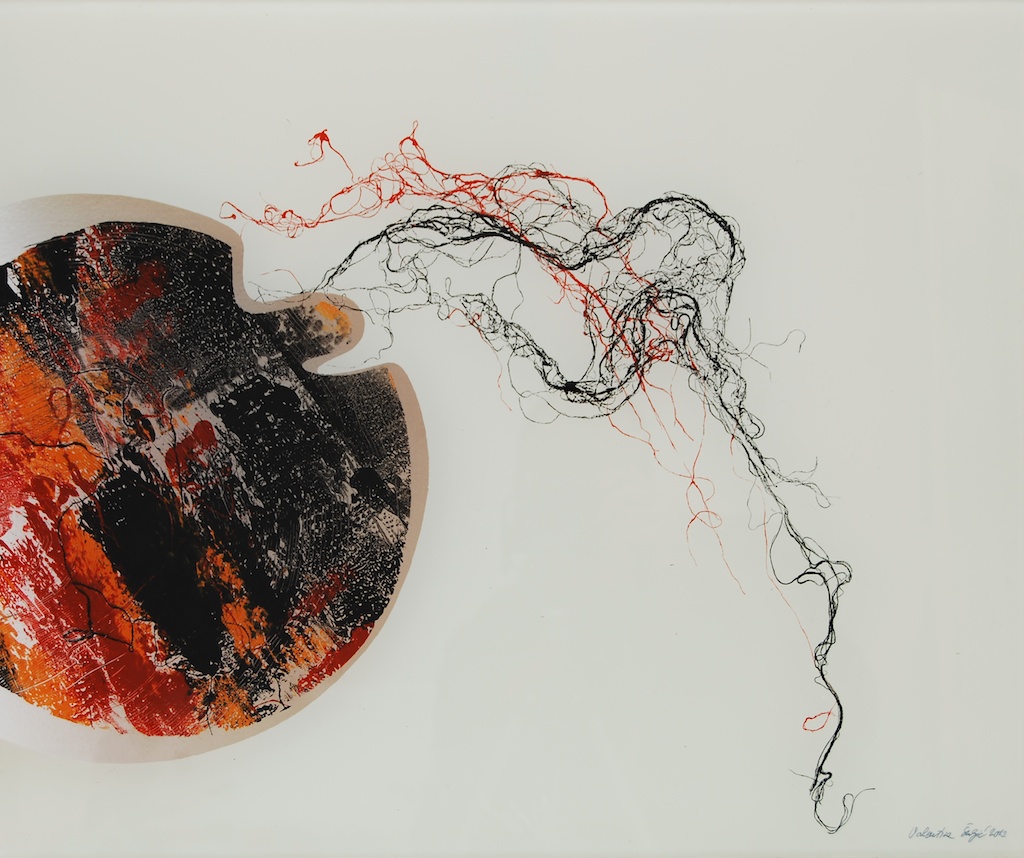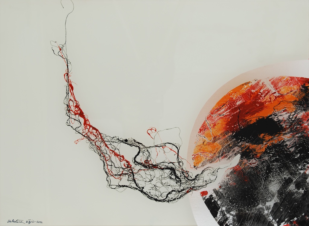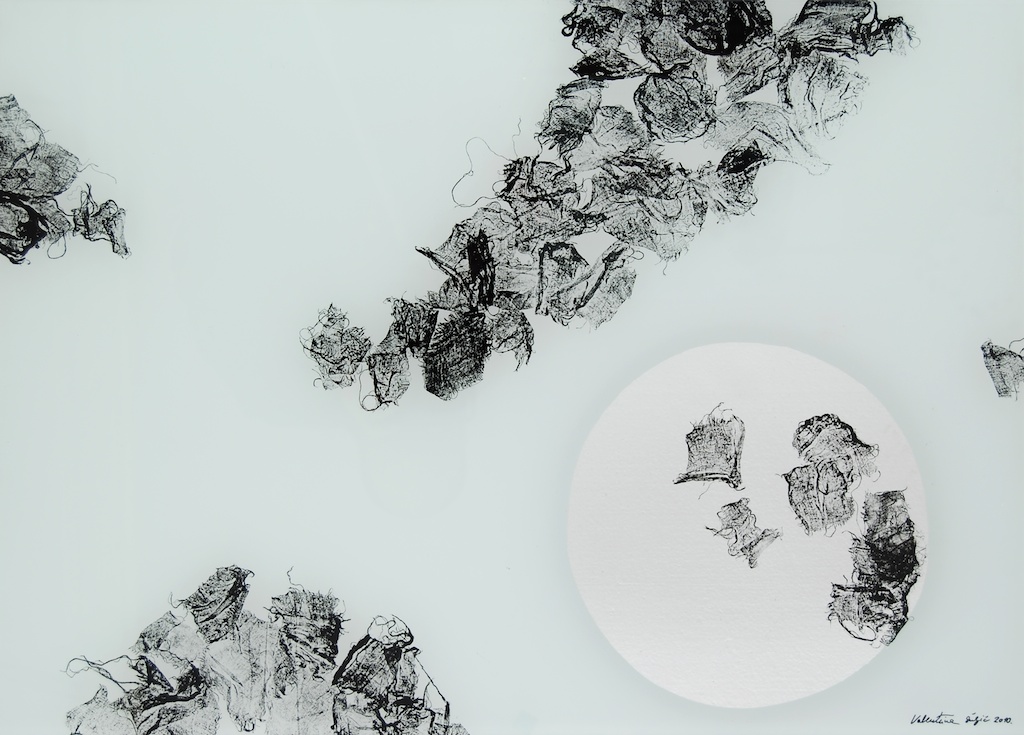 Konstanta u umjetnosti Valentine Šuljić čvrsta je i dinamizirana linija. Transformira se ona u njezinim već znanim radovima – monotipijama, uvijek u neki začudni splet apstraktnih mrlja i crtovlja, u kojem nema naznaka mimezisa. Ima međutim asocijacija na kružna gibanja i na pro- storne proboje, na dinamiku kretanja i na energetska pražnjenja, a što se sve može iščitati (i) kao prikaz internog autoričinog mikro–univerzuma, koji bilježi njezine misli i impresije, osjećanja i nervne vibracije. Pritom se taj mikro – univerzum, lakim preskokom kroz prostor i vrijeme, isto- dobno doživljava i kao makro – univerzum, jer ga nije teško zamisliti kao čudesnu presliku misterija života u bezgraničnim prostranstvima svemira. Možda baš zbog želje da se dobije dojam stalnih i nepredvidivih mijena, stalnih preskakivanja iz jedne zbilje u drugu i stalnih pulsacija linije u prostoru, Valentina Šuljić je prije nekoliko godina u svojim radovima počela koristiti transparentne podloge (staklo), koje nameću drukčije vizualne dijaloge. Zbog prozračnosti i vječne naklonjenosti svjetlu, prostorno – vremenska dimenzija tu postaje odmah drukčija, bez obzira na to što je linijski kompozicijski raster u Valentine strogo artikuliran i discipliniran. Kad se njezina linija kreće tim prostorom, ona u njemu stvara gibanje i energiju. S druge strane, upravo zbog transparentnosti podloge gubi se osjećaj zbiljnosti, a prevladava imaginarnost. Dojam je kao da se linijski spletovi šire i kovitlaju u nekim drugim dimenzijama, izvan realne percepcije. Zato je sve tu nekako „taktilno sklisko“ i balan- sira na rubovima opipljivoga i neopipljivoga, dok se opažaj neosjetno, ali kontinuirano transformira: prvo u promatračevu oku, a onda u nje- govu duhu, redefinirajući osjet i stvarajući od vida privid, te naposljetku jednu novu – presloženu stvarnost.
